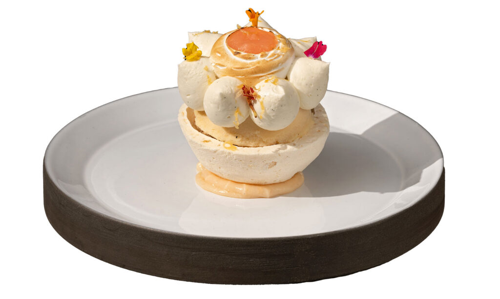 A pavlova is a meringue-based dessert; a vacherin suggests an ice cream cake. Amelia Marneau, pastry chef/co-owner at the French bistro, goes beyond the best of both with Between a Pavlova and a Vacherin. The gorgeous construct stars grapefruit in several guises, hazelnut biscuit Joconde and meringues. It’s an unforgettable cap to any special evening.