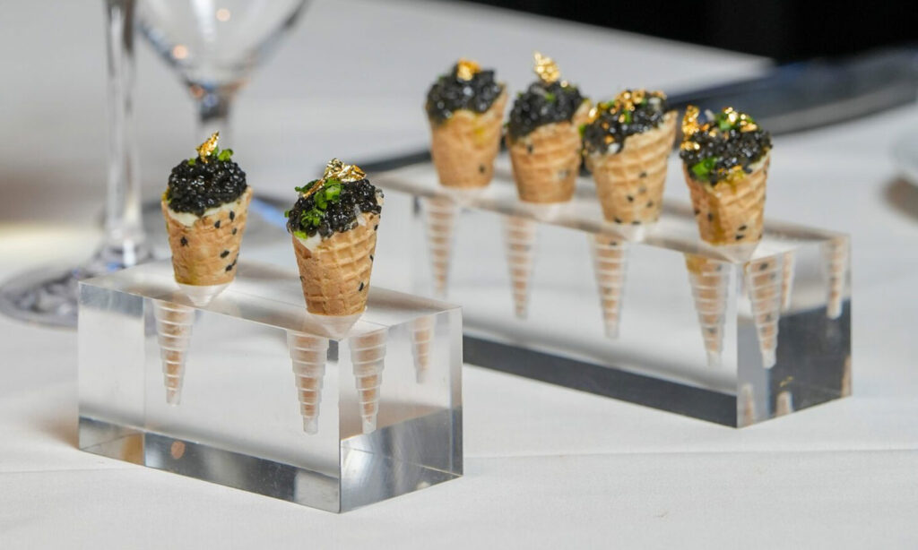 For the delicacy that makes any meal a celebration, Ocean 48 at Fashion Island offers three grades of osetra caviar — Siberian, Royal or Imperial by Sasanian — with fresh blinis and accompaniments. A glass of Dom Perignon goes well. Caviar cones present the exquisite sturgeon roe with horseradish crème fraiche and gold leaf.