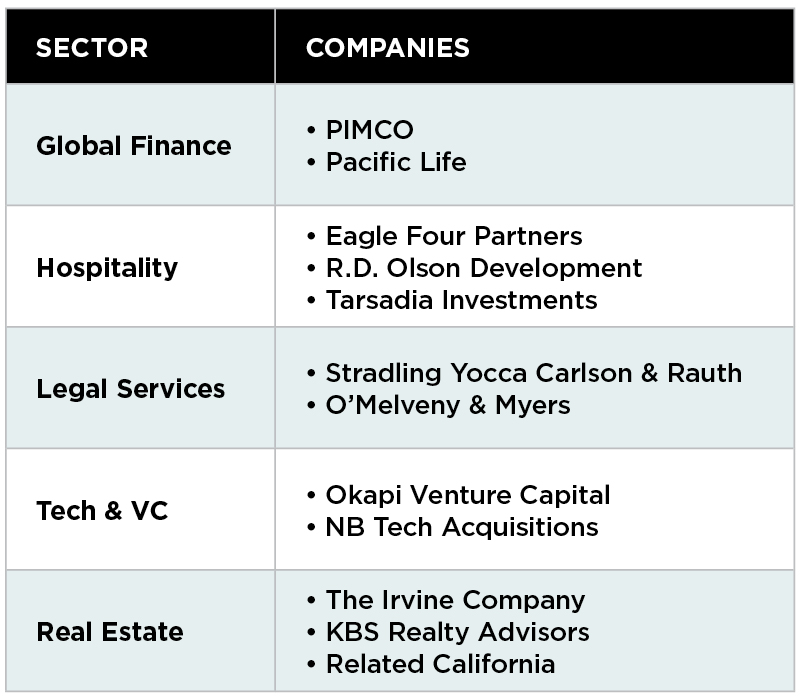 Newport Center represents a unique concentration of corporate activity in Southern California. Along with world-class retail, hotels and hospitality, this master-planned district in Newport Beach serves as a strategic hub for major asset managers, commercial real estate developers, established law firms and technology companies. The following chart outlines the five primary business sectors operating within this economic center, along with the key corporations anchoring each industry.