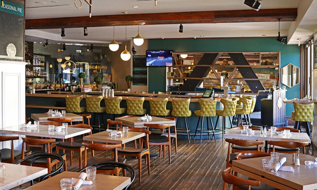 The “comfort” at upscale comfort eatery Great Maple translates to tufted vegan leather seats and to menu items such as the fried chicken and doughnuts and maple-bacon old-fashioned. There’s sports-viewing in the bar and people-watching from the Nordstrom Court-adjacent patio.